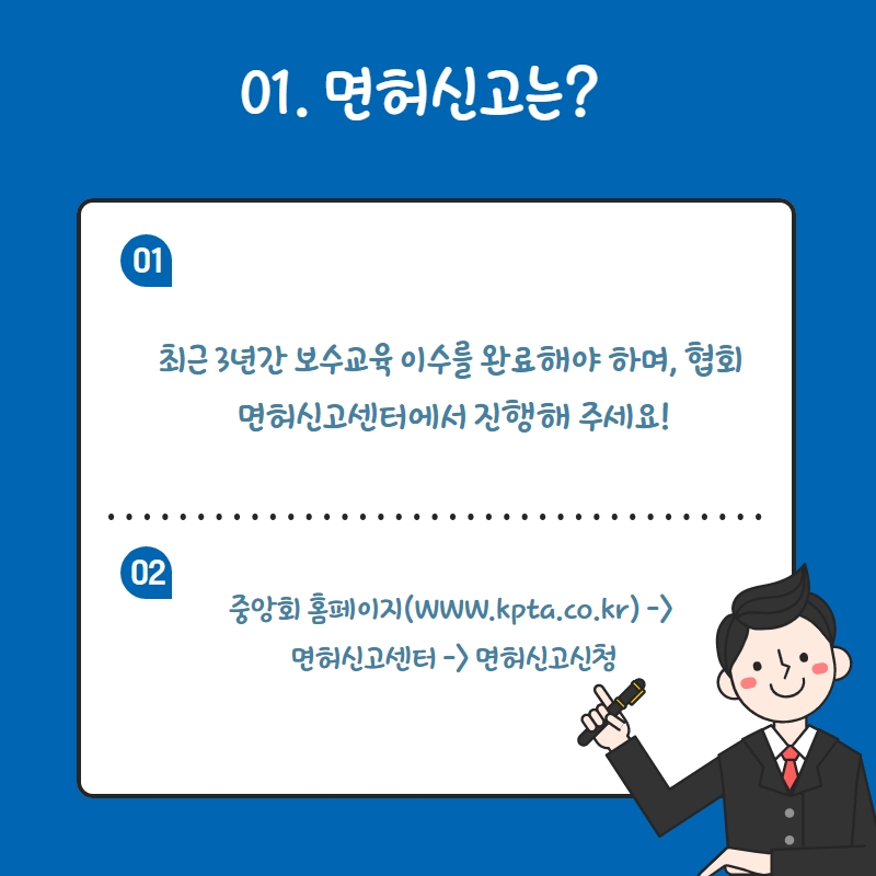 신고절차 : 중앙회 홈페이지(www.kpta.co.kr) -> 면허신고센터 -> 면허신고신청