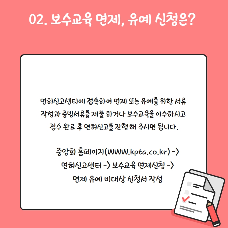 보수교육 면제, 유예신청 : 보수교육 면제대상자 또는 유예 신청을 해야하는 회원분들 께서는 중앙회 홈페이지(www.kpta.co.kr)