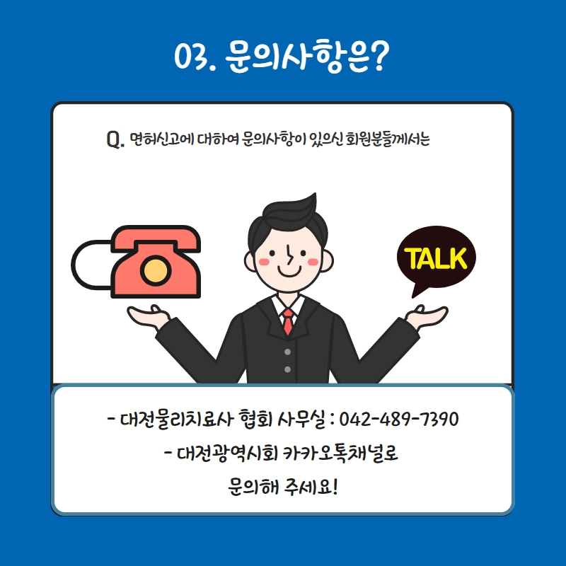 문의사항은 대전광역시회 카카오톡 채널(http://pf.kakao.com/_fkwyK) 또는 대전물리치료사협회 사무실(042-489-7390)으로 문의 바랍니다.