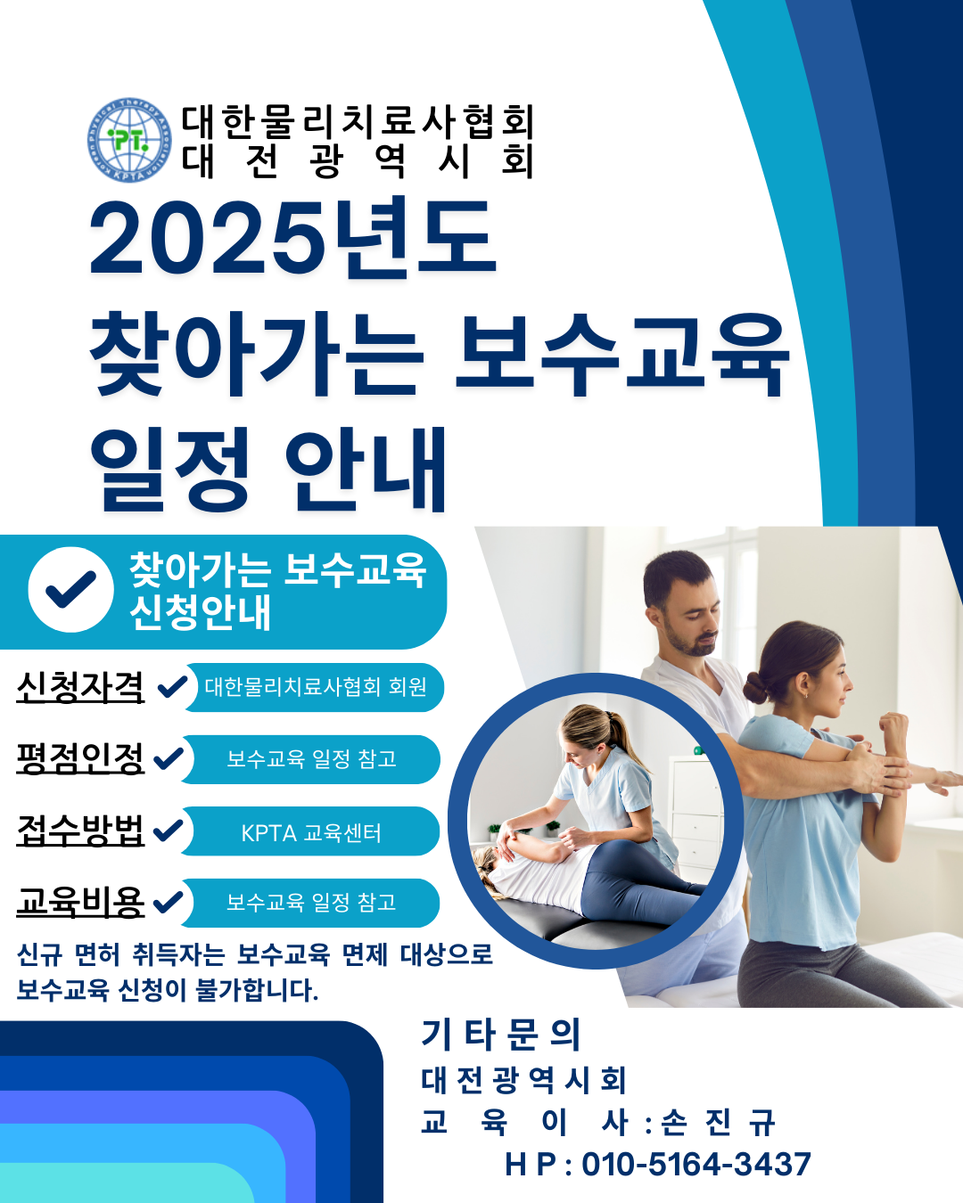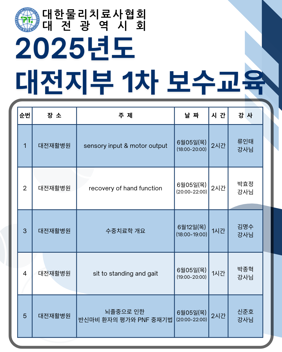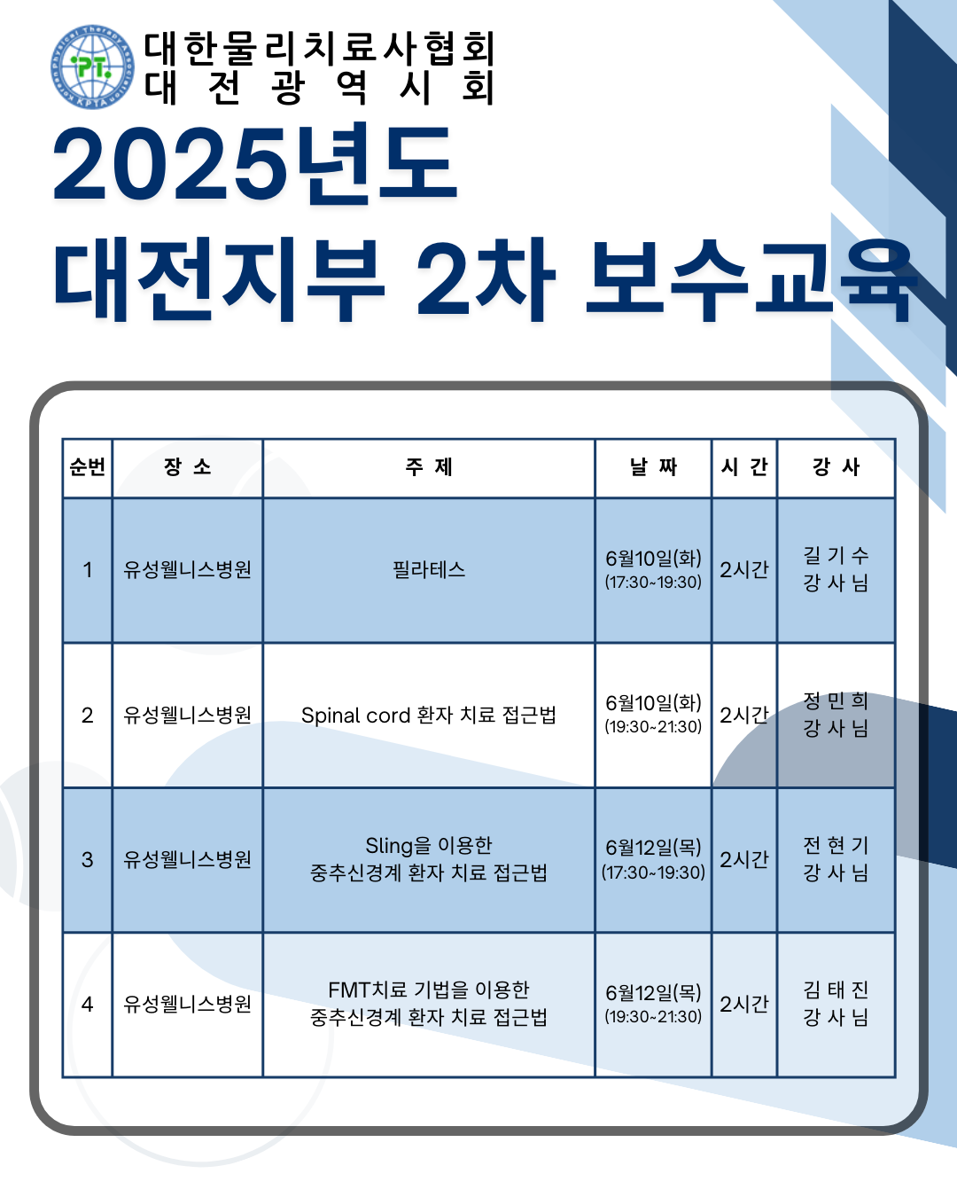 6월에 진행하는 2025년 1차, 2차 보수교육 안내입니다. 상반기에는 재활병원을 중심으로 찾아가는 보수교육으로 진행합니다. 병원 상황과 진행하는 사업으로 인해 올해는 1차에는 대전재활병원 2차에는 유성웰니스병원에서 진행합니다.