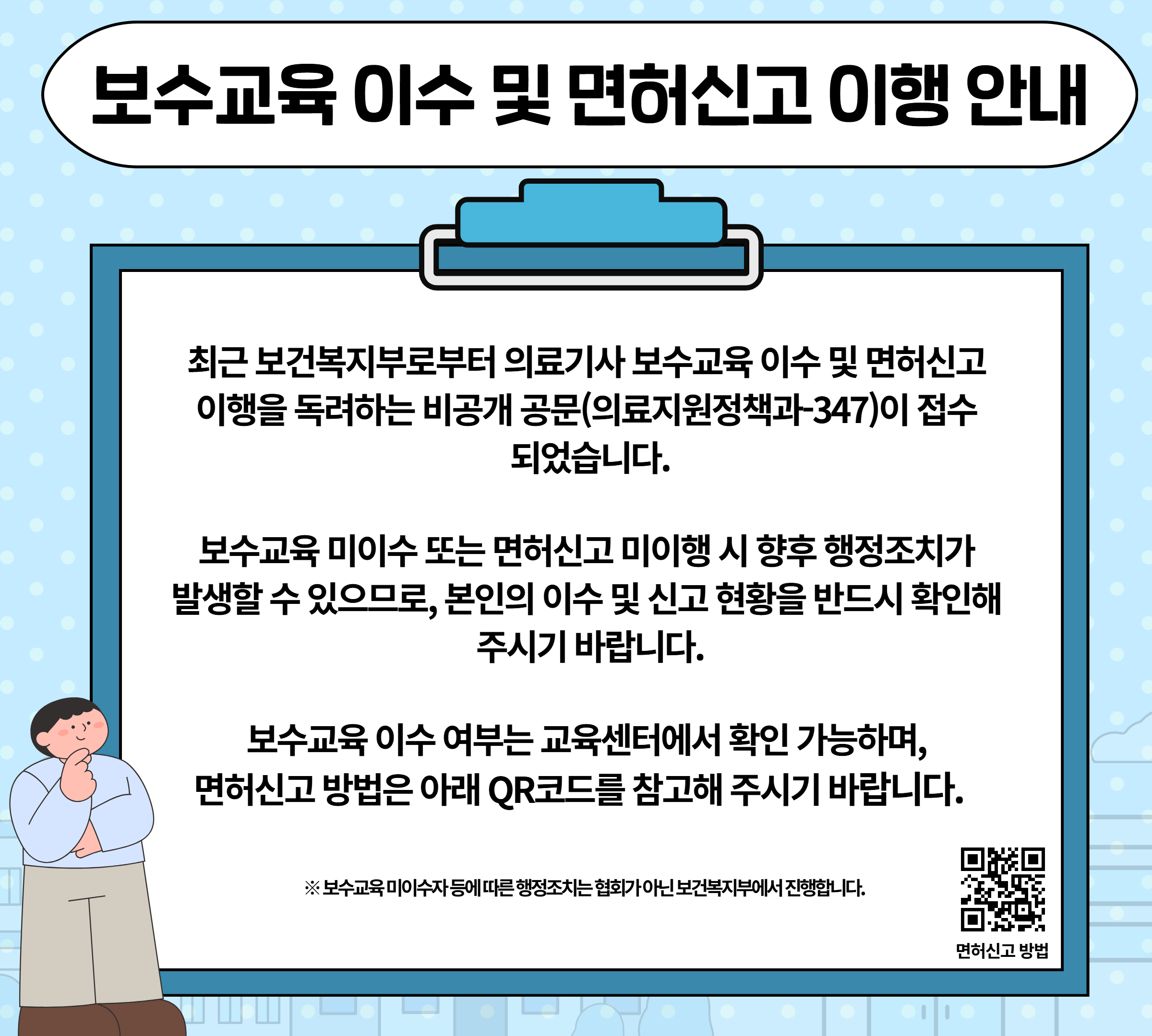 변경: 보수교육 미이수, 면허신고 불이행 등에 따른 행정조치는 협회가 아닌 보건복지부에서 진행합니다.
