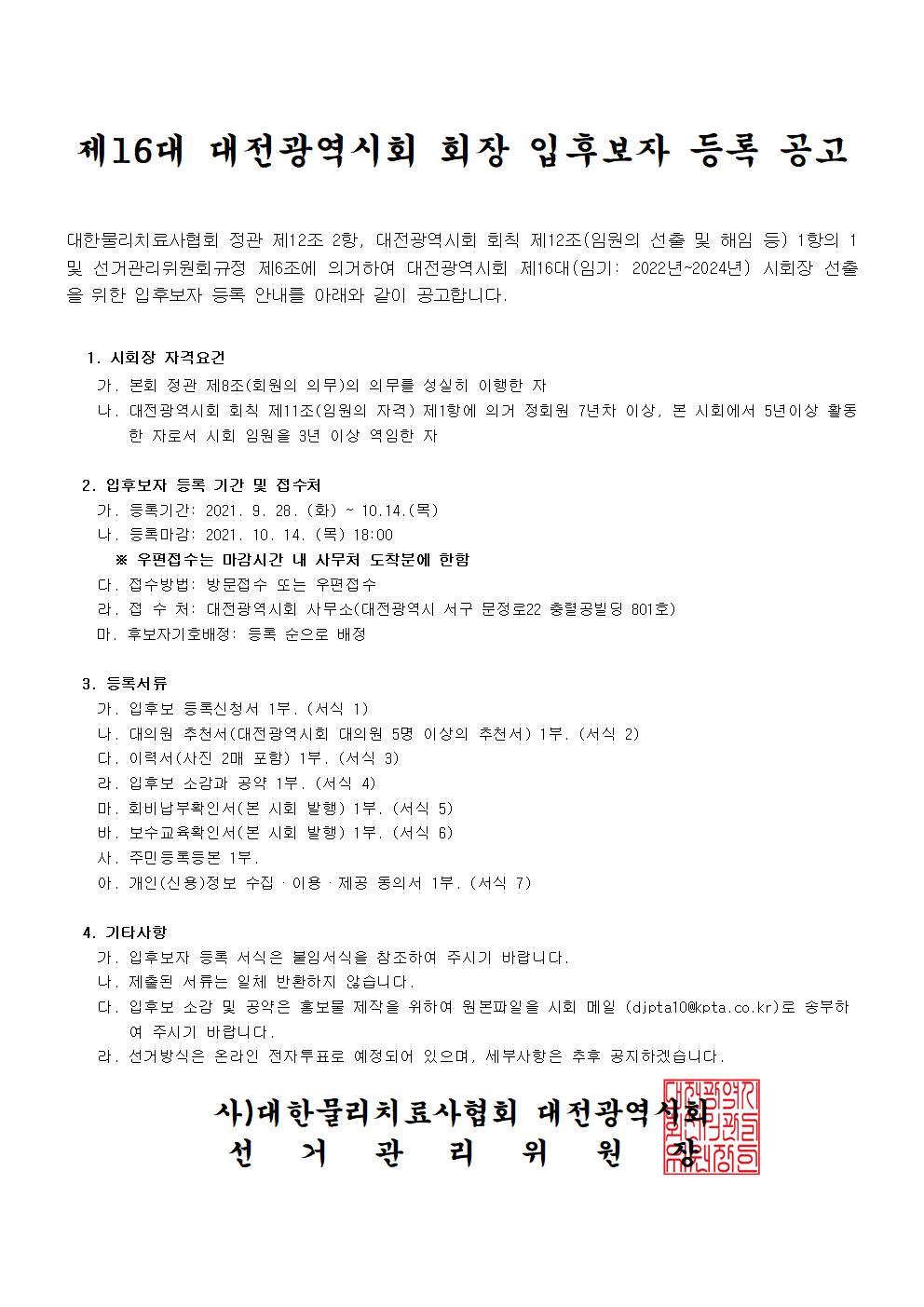 2. 사단법인 물리치료사협회 대전광역시 선거관리위원회(이하 위원회)에서는 대한물리치료사협회 정관 제12조 2항, 선거관리위원회규정 제6조 및 대전광역시회 회칙 제12조 1항의 1에 의거하여 대전광역시회 제16대(임기: 2022년~2024년) 시회장 선출을 위한 선거 공고 및 입후보자 등록 안내를 아래와 같이 공고 합니다.