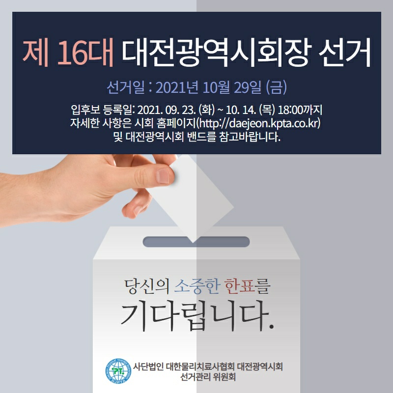 다. 선거일정1) 선거인명부열람기간: 2021. 10. 8. ~ 10. 26. (평일 09:00 ~ 17:00)2) 입후보자 공고: 2021. 10. 15. (금)시회장 입후보시 필요한 사항 등 선거와 관련한 사항은 시회사무처(042-489-7390) 및 카카오톡채널(채널명: 대전물리치료사협회)에 문의하여 주시기 바랍니다.